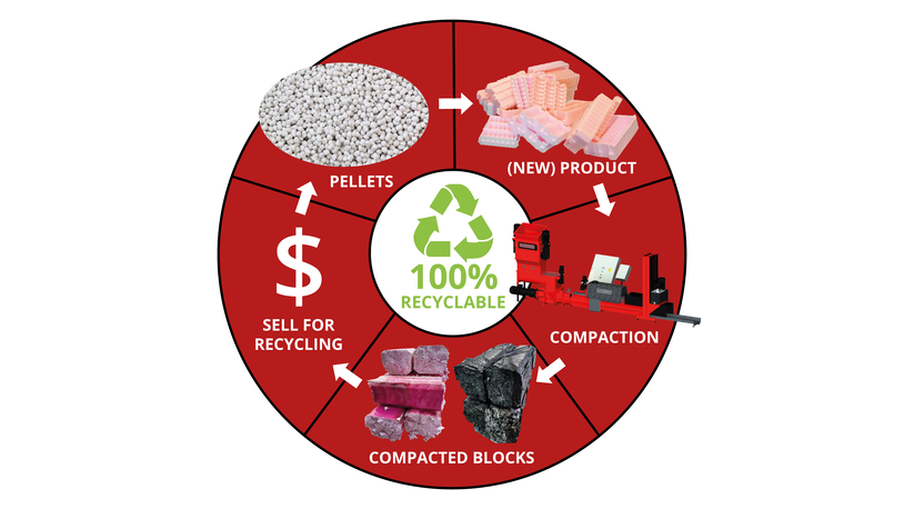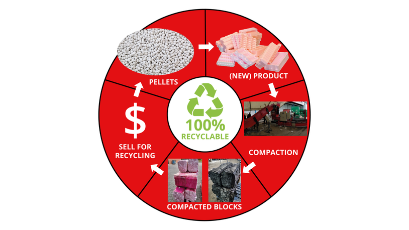 Når den komprimerede EPP forlader RUNI maskinen, vil det være solide, firkantede blokke på 380x380 mm. Disse blokke kan sælges til genanvendelse. Derfor er affaldet nu en indtjeningskilde i stedet for en omkostning.
